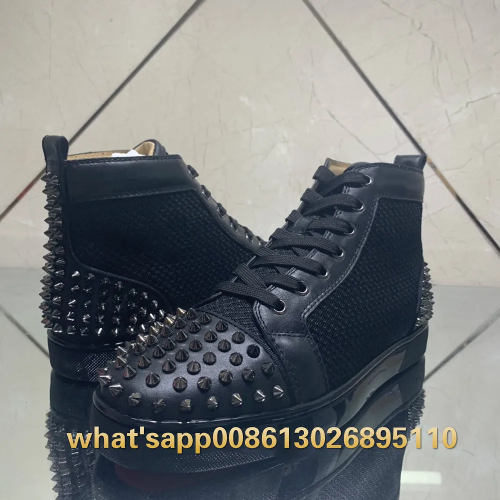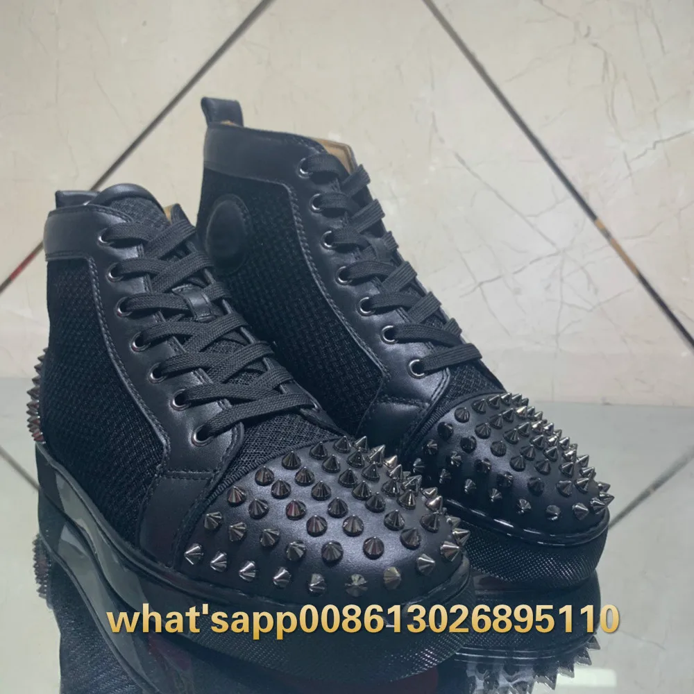 Best Quality High Top Low Cut black Net Leather Handmade Silver Rivet Toecap heel Red bottoms Shoes Sneakers For