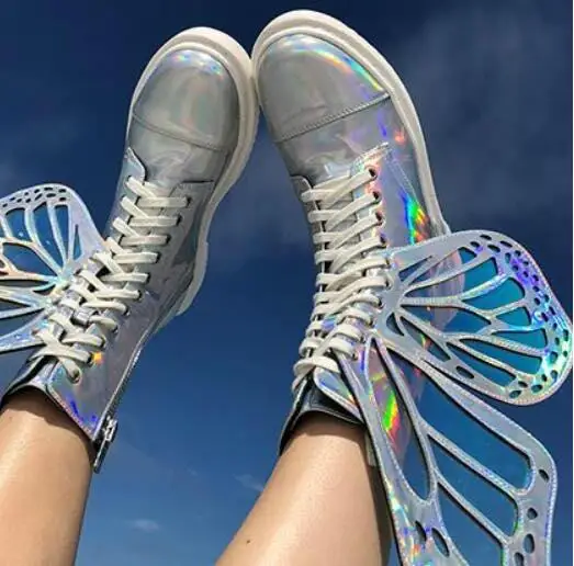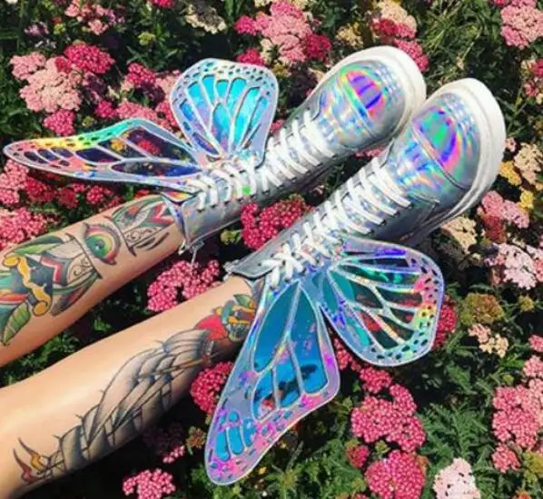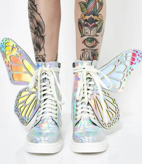 REVIEW TOP SELLER Laser Sliver Black Pink Girls Big Butterfly Wings Decoration Round Toe Zipper Lace Up High Top Snea