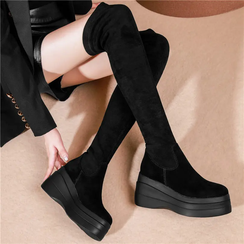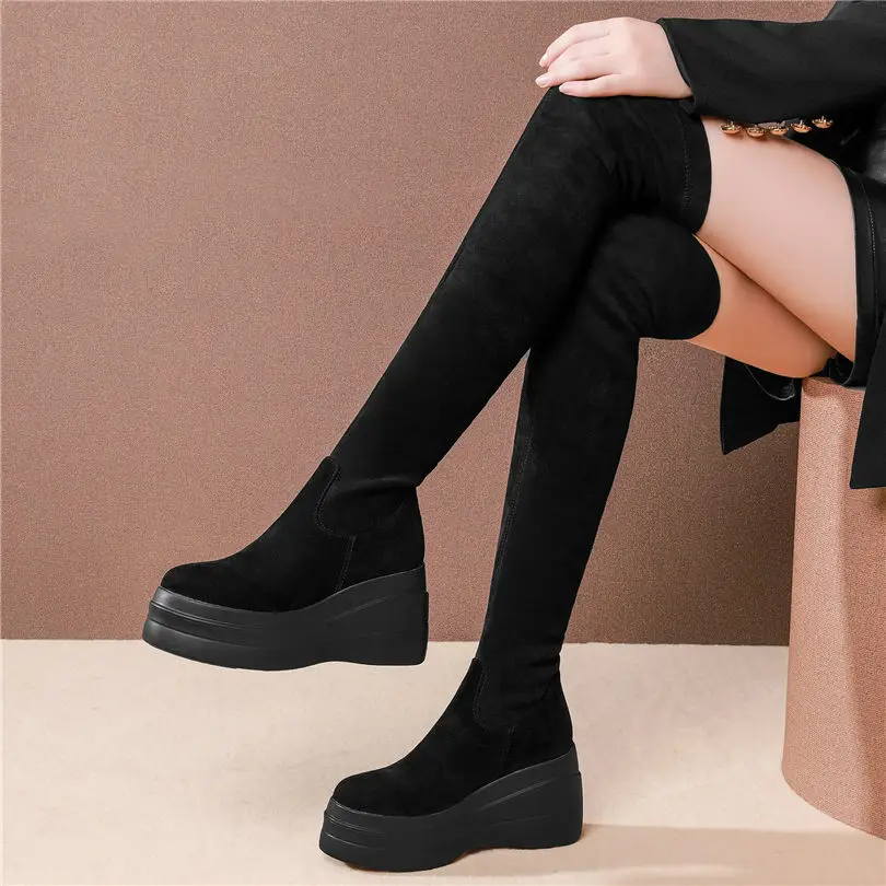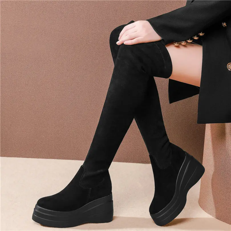 2019 Women Black Genuine Leather High Heel Stretch Over The Knee Boots Slim Leg Punk Goth Sneakers